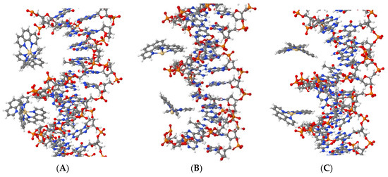 Figure 9). Cd(Phen)3 predominantly enters the major groove, and the penetration into the minor group is partial, i.e., by one 1,10-phenanthroline residue. Cd(Phen)3 cannot enter the minor groove fully due to its large size. Cd(Phen)2 (in cis- and trans-conformations) enters predominantly into the minor groove of DNA. It can be noted that they are attracted to phosphates. Note that the simulation used cannot visualize the intercalation of the 1,10-phenanthroline ligand. At this stage, we can say that the task regarding the DNA interaction with the considered compounds requires a more detailed analysis, which we will carry out in further work.