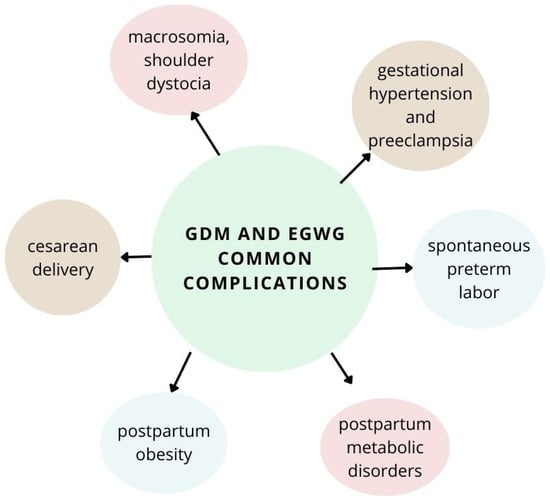 GDM is one of the most common diseases that occur during pregnancy and has long-term effects on the mother and her offspring by increasing the risk of developing metabolic diseases in the future. GDM is a condition of glucose intolerance diagnosed for the first time during pregnancy without a known history of glucose metabolism disorders before [,]. EGWG is diagnosed by exceeding the recommended weight gain depending on pre-pregnancy weight according to the IOM 2009 criteria []. Its occurrence is associated with numerous complications, including the development of GDM [].