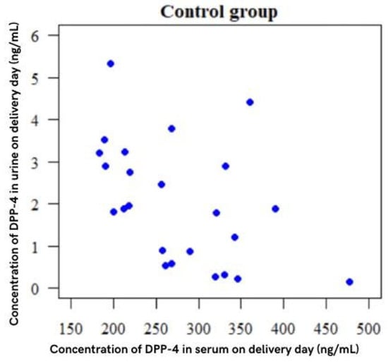 Serum DPP-4 levels were significantly higher in the GDM and EGWG groups compared to healthy women, while urine levels appeared to be significantly increased in the control and GDM groups compared to the EGWG group. We also observed a negative correlation between serum and urine DPP-4 concentrations in the control group, with no significant relationship in the other groups (Figure 3).
