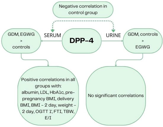 The aim of our study was to further investigate the relationship between DPP-4 concentrations with the occurrence of GDM and EGWG and to correlate them with clinical parameters. We hypothesized that DPP-4 serum and urine levels would be higher in GDM and EGWG groups compared to healthy controls. We also hoped to reveal some associations between DPP-4 concentrations and metabolic parameters.