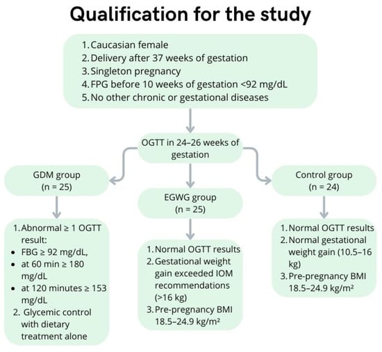 The GDM group included patients whose fasting blood glucose before 10 weeks of pregnancy was normal, but they had an abnormal OGTT result between 24 and 26 weeks of pregnancy. At least one of the measurement results was in the following ranges: fasting blood glucose ≥ 92 mg/dL, at 60 min ≥ 180 mg/dL, and at 120 min ≥ 153 mg/dL, which allowed us to diagnose GDM. Considering we only qualified patients with normal glycemic control with dietary treatment alone, women with pre-pregnancy overweight were also included. The Polish Diabetes Association does not recommend treatment with oral antidiabetic drugs at this point [].