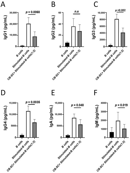 Inhibition of B-cell immunoglobulin production by CB-SCs. B cells were stimulated in the presence of cocktails (anti-IgM, rCD40L, IL-2, IL-4, IL-10, IL-21). CB-SCs markedly inhibit Ig production of stimulated B cells at a ratio of CB-SC/B-cells of 1:5. Untreated B cells served as negative control. (A) CB-SCs inhibit IgG1 production. p = 0.0068 (N = 4). (B) CB-SCs inhibit IgG2 production. p = 0.330 (N = 6). (C) CB-SCs inhibit IgG3 production. p = 0.002 (N = 4). (D) CB-SCs inhibit IgG4 production. p = 0.0035 (N = 6). (E) CB-SCs inhibit IgA production. p = 0.048 (N = 4). (F) CB-SCs inhibit IgM production. p = 0.019 (N = 6). n.s., p > 0.05.