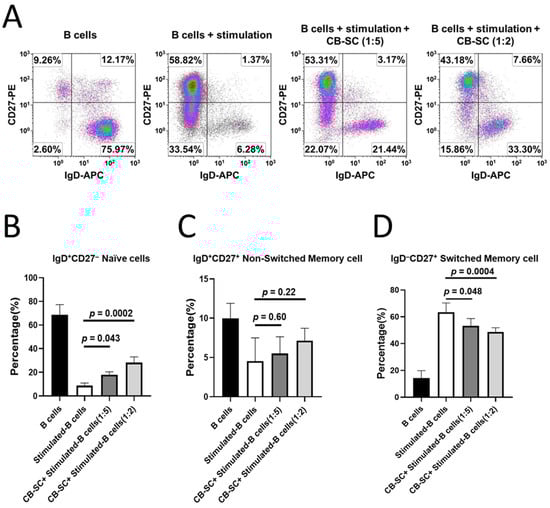 CD27 and IgD are the widely accepted biomarkers that are used to characterize B cells into memory and naïve subsets, such as naïve B cells (CD27−IgD+), switched memory B cells (CD27+IgD−), and non-switched memory B cells (CD27+ IgD+) [31]. To further explore the effects of CB-SCs on memory B cells, the activated B cells were treated with or without CB-SCs. Flow cytometry established that both the percentages of naïve B cells and switched B cells were significantly downregulated after the B-cell activation. However, their percentages were markedly changed after the treatment with CB-SCs (Figure 3A,B,D). The percentage of naïve B cells was increased from 8.79 ± 2.14 for CB-SC-untreated B cells to 28.23 ± 4.82 for CB-SC-treated B cells at a CB-SC/B cell ratio of 1:2. (p = 0.0002, Figure 3B). On the other hand, the percentage of switched memory B cells decreased from 63.53 ± 6.85 for CB-SC-untreated B cells to 48.75 ± 3.09 for CB-SC-treated B cells at a CB-SC/B cell ratio of 1:2. (p = 0.0004, Figure 3D). Notably, the percentage of non-switched CD27+IgD+ memory B cells failed to mark changes before and after the treatment with CB-SCs (Figure 3C). The data suggest the modulation effect of CB-SCs on the B-cell differentiation.