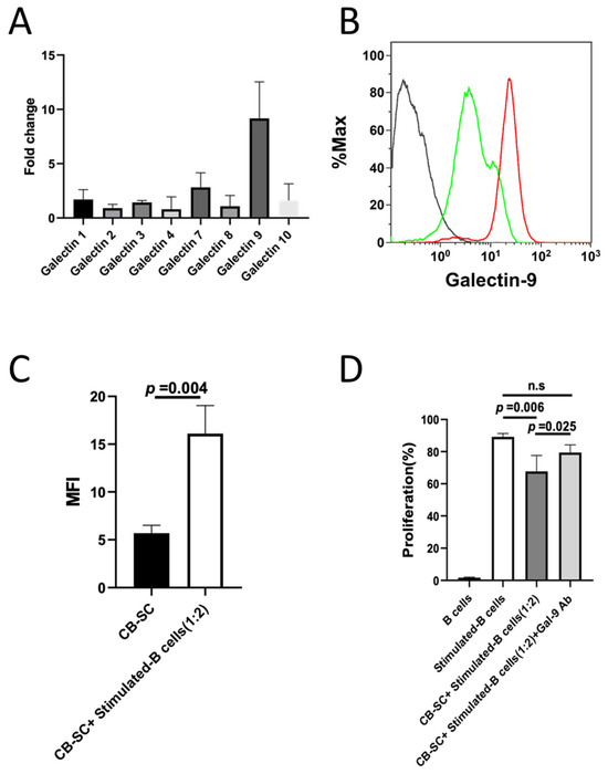 Gal-9 expressed on CB-SC acts as the key mediator for the CB-SC-induced B-cell suppression. (A) Changes in the levels of galectin expressions after coculture of CB-SCs with the stimulated B cells for 2 days (N = 3). (B) Upregulated level of Gal-9 expression on CB-SCs after coculture with stimulated B cells (red line) relative to that on the untreated CB-SC (green line). Isotype-matched IgG served as negative control. N = 3. (C) Increased level of Gal-9 expression (median fluorescence intensity, MFI) on CB-SCs after coculture with stimulated B cells. The data are given as mean ± SD of three experiments with CB-SC (N = 3)-treated B cells (N = 3). (D) Stimulated B cells were cocultured with CB-SCs at ratio of 1:2 in the presence or absence of Gal-9 mAb blocking. The inhibition of CB-SCs on B-cell proliferation was abolished after blocking with Gal-9 mAb (stimulated B cells with CB-SC vs. stimulated B cells + CB-SC + Gal-9 mAb, p = 0.025, N = 4), n.s., p > 0.05. The carboxyfluorescein succinimidyl ester (CFSE)-labeled B cells were stimulated to proliferate with activation cocktails in the presence of CB-SCs at ratio of 1:2 in 24-well plate at 37 °C with 8% CO2 for 7 days and followed by flow cytometry. Untreated B cells served as negative control.