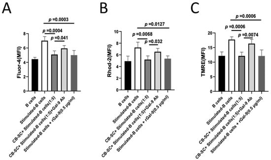 The activation and proliferation of B cells are initiated by the B cell receptor (BCR), which triggers a number of signaling cascades [36]. Increases in the intracellular Ca2+ levels are essential in order to tune the B-cell responses and subsequent development post the BCR activation [37]. To further explore the molecular mechanism underlying the inhibition of B-cell proliferation by the treatment with CB-SCs, we examined the changes in cytosolic and mitochondrial Ca2+ levels in the CB-SC-treated B cells by flow cytometry after being stimulated with B cell-dependent activation cocktails. The cytosolic calcium level was assessed by using the Fluor-4 staining. As shown in Figure 6A, the median fluorescence intensity of Fluo-4+-activated B cells was markedly downregulated in the presence of CB-SC at a CB-SC/B cell ratio of 1:5 (p = 0.004). The suppressive effect on the cytosolic Ca2+ levels was reversed after the blocking with Gal-9 mAb (Figure 6A). The direct influence of Gal-9 on the cytosolic Ca2+ level was further evidenced by the attenuated cytosolic Ca2+ level upon 0.5 μg/mL recombinant Gal-9 (Figure 6A). Using the Rhod-2 staining as an indicator for the mitochondrial calcium, we were also able to demonstrate that the mitochondrial Ca2+ levels in the stimulated B cells were significantly reduced after the treatment with CB-SCs at a ratio of 1:5 of CB-SC to B cells (Figure 6B). Similar to the changes in the cytosolic Ca2+ levels, the mitochondrial Ca2+ levels in the CB-SC-treated B cells could be rebounded back upon blocking with the Gal-9 mAb (Figure 6B). In addition, a reduction in the mitochondrial membrane potential was also noticed with the stimulated B cells after the treatment with CB-SCs, and such a reduction was almost completely recovered after the blocking treatment with Gal-9 mAb (Figure 6C and Figure S5). All these data suggest that the Gal-9-mediated Ca2+ signaling pathway plays a key role in the CB-SC-induced modulation of the activated B cells.