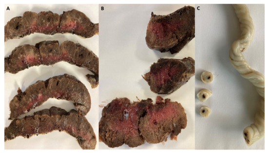 Figure 1. (A) Macroscopic image of placentas, serially sectioned, showing pale areas consistent with avascular villi; (B) thrombi in the chorionic plate vessels and stem villous vessels; (C) umbilical vein containing a thrombus.