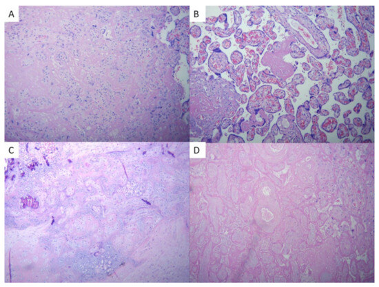 1. Levitan, D.; London, V.; McLaren, R.A., Jr.; Mann, J.D.; Cheng, K.; Silver, M.; Balhotra, K.S.; McCalla, S.; Loukeris, K. Histologic and Immunohistochemical Evaluation of 65 Placentas From Women With Polymerase Chain Reaction–Proven Severe Acute Respiratory Syndrome Coronavirus 2 (SARS-CoV-2) Infection. Arch. Pathol. Lab. Med. 2021, 145, 648–656. [Google Scholar] [CrossRef]