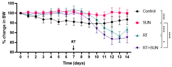 Prebble, A.R.; Latka, B.; Burdekin, B.; Leary, D.; Harris, M.; Regan, D.; Boss, M.-K. Investigation of Gastrointestinal Toxicities Associated with Concurrent Abdominal Radiation Therapy and the Tyrosine Kinase Inhibitor Sunitinib in a Mouse Model. Int. J. Mol. Sci. 2024, 25, 1838. https://doi.org/10.3390/ijms25031838