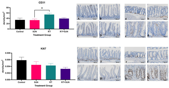 - Karamanolis, G.; Delladetsima, I.; Kouloulias, V.; Papaxoinis, K.; Panayiotides, I.; Haldeopoulos, D.; Triantafyllou, K.; Kelekis, N.; Ladas, S.D. Increased expression of VEGF and CD31 in postradiation rectal tissue: Implications for radiation proctitis. Mediat. Inflamm. 2013, 2013, 515048. [Google Scholar] [CrossRef] [PubMed]