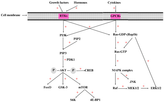 Activation of PI3K/AKT/mTOR and MAPK signaling pathways. The binding of various growth factors, hormones, and cytokines to receptor tyrosine kinase (RTK) or G-protein-coupled receptors (GPCRs) leads to the activation of phosphatidylinositol 3-kinase (PI3K), which induces the phosphorylation of phosphatidylinositol (4,5)-bisphosphate (PIP2) to phosphatidylinositol (3,4,5)-triphosphate (PIP3), inducing protein kinase B (AKT) activation by phosphorylation by phosphoinositide-dependent kinase 1 (PDK1). Once activated, p-AKT activates other substrates by phosphorylation, such as the mammalian target of rapamycin (mTOR), glycogen synthase kinase-3 (GSK-3), the Forkhead box proteins (FoxOs) and c Adenosine monophosphate (cAMP) response binding protein (CREB). mTOR activates other proteins such as eukaryotic initiation factor binding protein 1 (4E-BP1) and ribosomal protein S6 kinase beta-1 (S6K), also known as p70S6 kinase. Mitogen-activated protein kinase (MAPK) complex activation starts with the formation of Ras-GTP from the inactive form Ras-GDP, which further activates the downstream substrates, including Raf, MAPK kinase (MAPKK or MEK), extracellular-signal-regulated kinases (ERK1/1), and c-jun N-terminal kinase or stress-activated protein kinase (JNK). In healthy cells, activation of these signaling pathways sustain the normal functions of the cells. Note: + denotes activation.