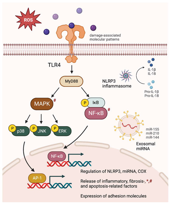 miRNAs exert post-transcriptional regulation over various genes, including the NLRP3 inflammasome [76]. miR-155, miR-210, and miR-144 all provide positive feedback to NLRP3 activation [77,78,79]. The NLRP3 inflammasome is an oligomeric molecular complex that responds to endogenous stress and triggers innate immune defenses through the maturation of the pro-inflammatory cytokines IL-1β and IL-18 [80].