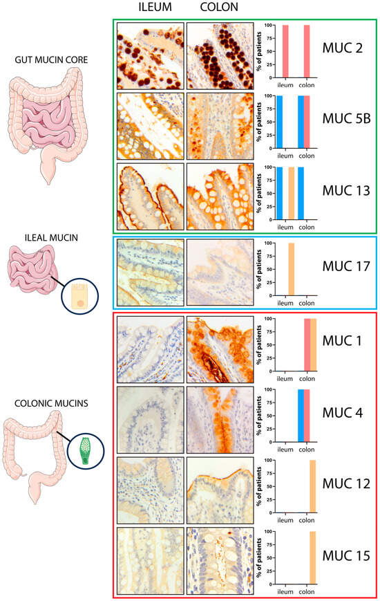 Biopsy specimens were formalin-fixed and paraffin-embedded (FFPE), and then cut sequentially into multilevel three-micron-thick slices. For histological analysis, they were stained with hematoxylin-eosin dyes. Immunohistochemical analysis focused on eight mucins (MUC1, MUC2, MUC4, MUC5B, MUC12, MUC13, MUC15, and MUC17), selected for their documented expression in the gut mucosa (http://www.proteinatlas.org (accessed on 30 January 2024)). The antibodies used in these analyses are provided in Table S4.
