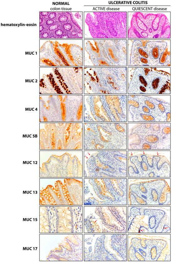 Mucus forms a barrier that protects the gut epithelial lining from injuries and controls the resident flora. Normal mucus–microbiota interplay contributes to gut homeostasis [3]. Altered mucin production is able to weaken the mucus barrier (MB), triggering an immune response and predisposing to UC onset [11,12,13,14]. From a histological perspective, the finding of mucin depletion in the mucosal samples from UC patients points toward perturbations in mucin production, as confirmed by mucin gene expression profiling [15,16]. Impairment of MUC2 expression has been reported to be a major cause of mucosal injury in IBD [11,17,18,19].