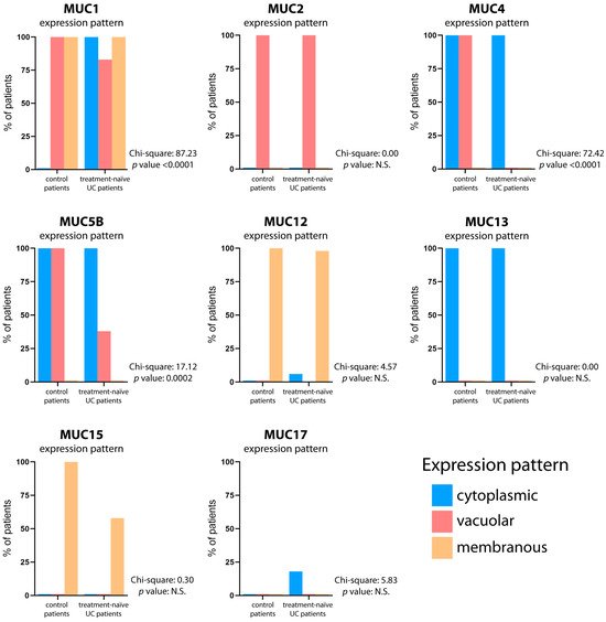 Mucin expression pattern comparison between control and treatment-naïve UC patients. The graphs depict the mucin expression patterns in both the normal gut and treatment-naïve UC patients. The percentage of patients displaying cytoplasmic (blue bar), vacuolar (red bar), and membranous (yellow bar) expression patterns is reported. The contingency test (Chi-square test) was utilized to assess the statistical significance of agreement in mucin expression patterns, with a significance level set at p < 0.05.