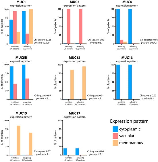 Mucin expression pattern comparison between relapsing and remitting UC patients. The graphs depict the mucin expression patterns in both the relapsing and remitting UC patients after first-line treatment. The percentage of patients displaying cytoplasmic (blue bar), vacuolar (red bar), and membranous (yellow bar) expression patterns is reported. The contingency test (Chi-square test) was utilized to assess the statistical significance of agreement in mucin expression patterns, with a significance level set at p < 0.05.