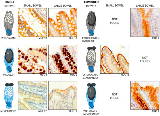 Immunohistochemical results were interpreted according to the intestinal segment (ileum vs. colon) and the sub-cellular compartment, as follows: membranous (m), when a mucin was expressed on the apical membrane of goblet cells; cytoplasmic (c), when it was expressed in the cytoplasm, but not vacuoles; and vacuolar (v), when it was found only in cytoplasmic vacuoles. Combinations of these patterns were also considered (Figure 5). Images were acquired by using a Zeiss Axio Scope A1 microscope (Zeiss, Oberkochen, Germany).