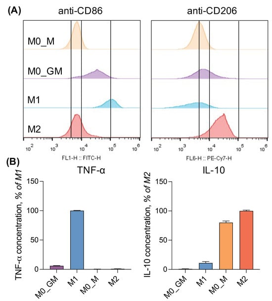 Macrophages were characterized by the expression of surface proteins, which serve as phenotype markers: CD86 indicated M1 phenotype, and CD206 indicated M2 phenotype. Macrophage functional response was determined by the secretion of cytokines—TNF-α for M1 and IL-10 for M2.