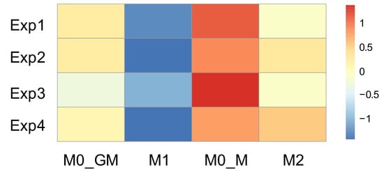 In our experiments, the monocytes were seeded at the same number per well of the plate. However, by the sixth day of differentiation with CSF, a difference in cell numbers between the M0_GM and M0_M groups was already observed. The differences between cells increased after macrophage polarization into M1 and M2 phenotypes. To assess differences, the concentration of double-stranded DNA was measured using PicoGreen dye since the amount of DNA correlates with the number of cells. The relative difference between groups in each individual experiment, rather than the absolute values of DNA concentrations, was important. Data of four independent experiments are presented in Figure 2 as a heatmap reflecting levels of DNA (ng/mL) lower (blue shades) and higher (red shades) than expected values for each sample. The results showed that the group of macrophages incubated with M-CSF had a higher number of viable cells compared to macrophages incubated with GM-CSF. Moreover, the number of living cells decreased after M0_GM polarization to M1 state. The addition of IL-4 to M-CSF treated macrophages also resulted in a slight decrease in the number of viable cells compared to M0_M.