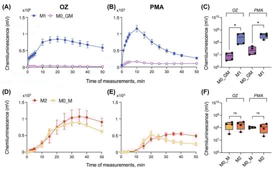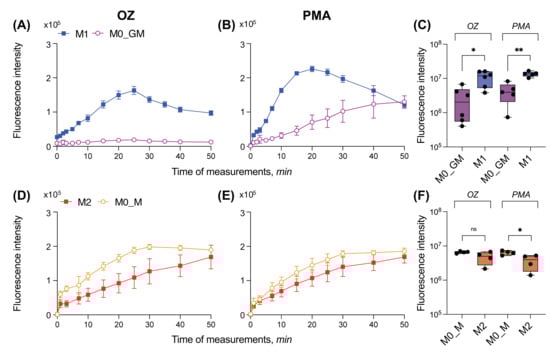 The addition of any of the activators to both types of macrophages differentiated in the presence of M-CSF caused CL comparable to the M1 level. Notably, M2 macrophages reached CL maximum significantly later than their precursor M0_M macrophages. Moreover, both M2 and M0_M macrophages activated with PMA reached CL intensity peak faster than those activated with OZ (Figure 3D,E and Figure S3). Significant differences in the intensity of the luminescence peaks of M0_M and M2 macrophages for both activators were not found (Figure 3F).