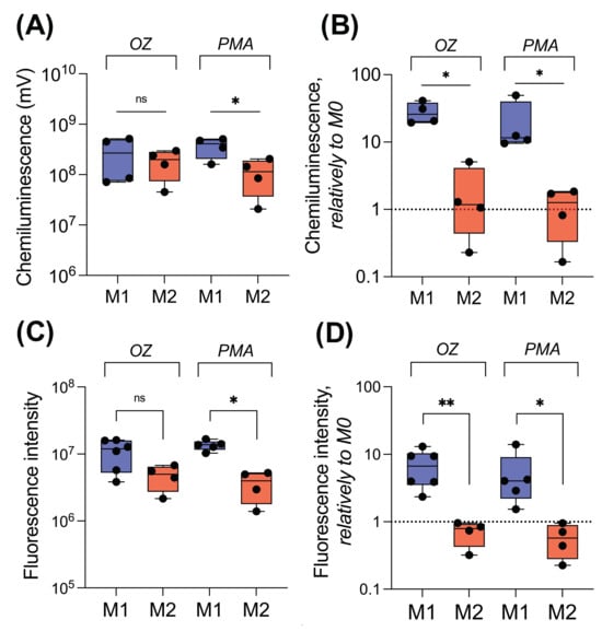 Comparison of radical-generating activity of human macrophages as assessed by CL (A,B) or Amplex Red oxidation (C,D). (A,C) represent the absolute values of the measured parameters; (C,D) represent the ratio of the measured parameter for M1 or M2 macrophages to the level of that parameter for the corresponding precursor (M0_GM or M0_M, respectively). n ≥ 4, ns p ≥ 0.05, * p < 0.05, ** p < 0.01.