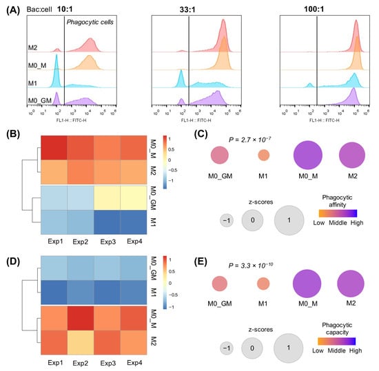 Phagocytosis activity of human macrophages assessed by flow cytometry. (A) Histograms of FITC fluorescence intensity distribution after incubation of different groups of macrophages with FITC-labeled E. coli bioparticles. The black vertical line separates the control group of macrophages not incubated with E. coli bioparticles (left) and the group of phagocytic cells (right). The ratio of bacteria to macrophage is indicated above the histograms. (B) Heatmap of the percentage of phagocyting macrophages in 4 biological experiments scaled to column z-score. (C) Average percentage of phagocyting cells in 4 groups of macrophages. Size and color represent z-score and phagocytic affinity, respectively. M1 versus M0_GM: p = 0.00561; M0_M versus M0_GM: p < 0.001; M2 versus M0_GM: p < 0.001; M0_M versus M1: p < 0.001; M2 versus M1: p < 0.001; M2 versus M0_M: p = 0.303, one-way ANOVA with post hoc Tukey test. (D) Heatmap of MFI, which reflects phagocytic capacity, in 4 groups of macrophages scaled to a column z-score. (E) Average median fluorescence intensity (MFI) in 4 groups of macrophages. Size and color represent z-score and phagocytic capacity, respectively. M1 versus M0_GM: p = 0.0351; M0_M versus M0_GM: p < 0.001; M2 versus M0_GM: p < 0.001; M0_M versus M1: p < 0.001; M2 versus M1: p < 0.001; M2 versus M0_M: p = 0.4206, one-way ANOVA with post hoc Tukey test).