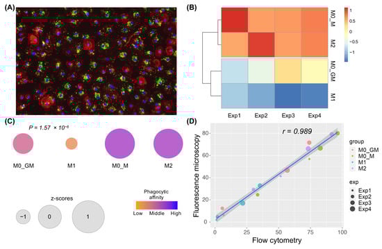 Analysis of phagocytosis activity of human macrophages assessed by fluorescence microscopy. (A) Fluorescence microscopy of fixed human macrophages after their incubation with E. coli bioparticles at a 10:1 ratio (20×). FITC green—E. coli bioparticles; red—phalloidin–rhodamine staining of the actin cytoskeleton; blue—DAPI, nuclear stain. (B) Heatmap of the percentage of phagocyting macrophages in 4 groups independent experiments scaled to column z-score. (C) Average percent of phagocyting cells in 4 groups of macrophages. Size and color represent z-score and phagocytic affinity, respectively. M1 versus M0_GM: p = 0.0038; M0_M versus M0_GM: p = 0.0018; M2 versus M0_GM: p = 0.0027; M0_M versus M1: p < 0.001; M2 versus M1: p < 0.001; M2 versus M0_M: p = 0.9936, one-way ANOVA with post hoc Tukey test. (D) Pearson correlation analysis of phagocytic affinity measured by flow cytometry and fluorescence microscopy. Label “group” is assigned to macrophage group, label “exp” is assigned to one of four biological replicates.