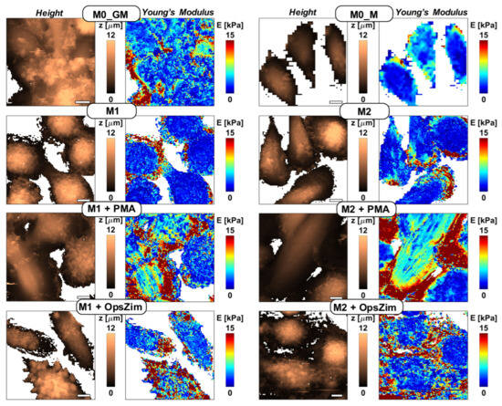 Macrophage polarization and activation evokes changes in cytoskeleton structure and membrane composition, what results in changes of cell morphology and membrane stiffness. AFM is a powerful tool to study the cellular morphology and bio-mechanics of immune cells []. Activation of RAW264.7 macrophages by LPS (100 ng/mL) caused changes in cell morphology and membrane ultrastructure and increased the Young’s modulus of cells, which was attributed to the redistribution of intracellular F-actin structures upon LPS treatment []. On the contrary, using colloidal force microscopy Leporatty et al. found that the stiffness of human macrophages decreased after cell stimulation by 10 µg/mL LPS []. The mechanical properties of macrophages are important in their interaction with the cell matrix and other cells involved in tissue regeneration and affect cell proliferation and migration [].