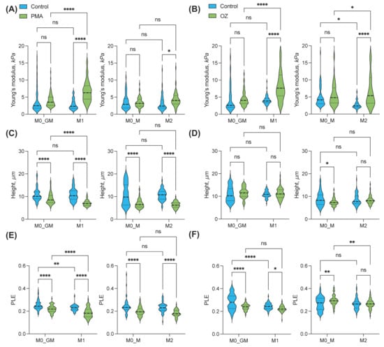 Young’s modulus (A,B), height (C,D), and power law exponent (PLE) (E,F) of human macrophages activated with PMA (left) and OZ (right). Two-way analysis of variance with Tukey post hoc test was performed to compare differences between groups. The analysis includes the results of 2 independent experiments, in each of which the studied parameters were measured for a minimum of 20 individual cells. ns p > 0.05, * p < 0.05, ** p < 0.01, **** p < 0.0001.