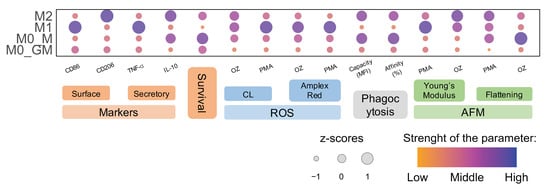 Comparative presentation of markers, functional activity, and mechanical properties of different phenotypes of MDM. Size and color represent z-score for each parameter measured.