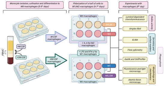 Briefly, blood was mixed with PBS and layered onto Histopaque-1077 (Sigma Aldrich, Saint Louis, MO, USA) for density gradient centrifugation at 400 g for 40 min. After centrifugation, the PBMCs layer was collected and cells were washed twice with PBS and plated at a density of 7.5–8.5 × 105 PBMCs/cm2. Cells were cultured in RPMI complete medium consisting of RPMI-1640 (Corning, Glendale, AZ, USA) supplemented with 10% autologous serum, penicillin (100 U/mL), and streptomycin (100 µg/mL) at 37 °C, 5% CO2. After 2 h of incubation, non-adherent cells were washed with PBS, and fresh RPMI complete medium containing 50 ng/mL GM-CSF or 50 ng/mL M-CSF (SCI-store, Moscow, MOW, Russia) was added to adherent monocytes to differentiate them into M0 macrophages (M0_GM and M0_M, respectively). The medium was replaced with the fresh one on the 3rd day of culturing. Before choosing the parameters for macrophage treatment, we reviewed the literature and used the optimal ones to compare four different polar macrophage phenotypes. There is a consensus regarding the concentrations of CSFs and treatment times used for monocyte differentiation into macrophages, but cytokines and LPS used for MDM polarization differ 2–20 times (Table S1 in Supplementary Materials). We applied the middle concentration of cytokines IFN-γ and IL-4 but the lowest concentrations of LPS because LPS was demonstrated to cause dose-dependent apoptosis in macrophages differentiated from THP-1 cells []. On the sixth day of culturing, M0 macrophages differentiated with GM-CSF were polarized into M1 macrophages by treatment with 10 ng/mL LPS and IFN-γ 50 ng/mL to the medium, while M0 macrophages differentiated with M-CSF were polarized into M2 macrophages by treatment with IL-4 20 ng/mL []. The corresponding precursor M0_GM and M0_M macrophages were kept without any polarization inducers, and only the medium was replaced. After two days of incubation, four phenotypes of MDM were used for the experiments (Figure 11).