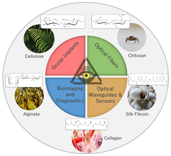 Sources and structures of proteins and polysaccharides and their common optical applications (photos obtained from Pixabay.com under the Pixabay Content License).