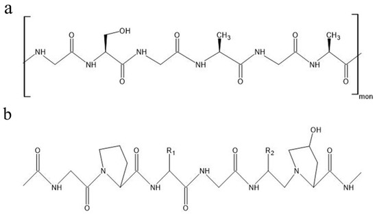 Chemical structures of protein biopolymers: (a) silk fibroin, (b) collagen type 1.