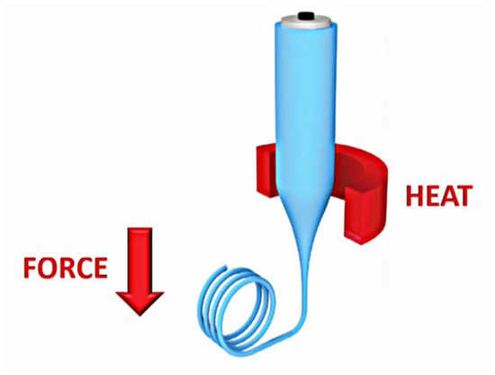 In the process, a molten polymer is forced into a die with a specified pattern to form a desired shape, a process commonly used for spider silk formation into optical waveguides. For continuous extrusion, a molten mixture of monomers, initiators, and additives are extruded in a continuous manner during which polymerization occurs inside a reactor [2]. Typically, batched extrusion is performed, where multiple batches of polymers are processed at once, which permits a direct and simplified polymer fiber fabrication technique, as this allows for more polymer fiber processing completed in less time for overall higher productivity. After the full conversion of starting materials, the reactor’s temperature is raised to form a polymer melt. Extrusion-based molecules use high amounts of force and temperature to dispense material through a micronozzle, with their shape and form of the fibers depending on the deployed extrusion die. This setup also provides additional customizability in the fabrication process, as in a die with an appropriate pattern used for manufacturing air-holed structures in any polymer-based materials [2]. While different printers and machines may have variety in the exact process for printing, extrusion-based processes obey the same principles for transforming a nonsolid polymer to a 3D fiber or other shape, which can be altered depending on the chemical composition and structure of the material.