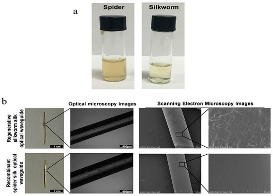 (a) Images of the casting process, shown by Qiao et al. for spider and silkworm silk. In this process, the silk is dissolved in a solvent, heated to eliminate water, and stored overnight. Finally, it can be removed from its mold. (b) Optical and SEM microscopy images of the fabricated optical waveguides; Scale bars = 1 cm (camera), 500 μm (optical microscopy), 1 mm (low magnification SEM) and 10 μm (high magnification SEM). [30] (reproduced with permission from American Chemical Society, 2017).