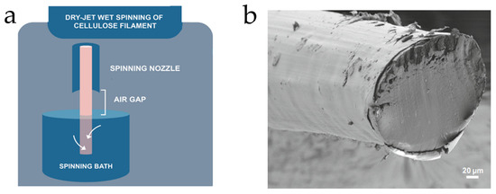 In a study conducted by Orelma et al., an optical fiber composed of cellulose was fabricated using dry-jet wet spinning, with a core made of dissolved cellulose dry-wet jet spun into the water and cladding made of cellulose acetate [32]. The cellulose was dissolved in the solvent, filled in a plastic syringe, and passed through the nozzle into the water coagulation bath, where the filaments remained for two hours and dried under tension. An SEM image of the fiber is shown in Figure 6b.