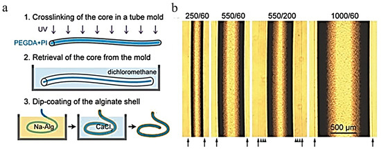 (a) A breakdown and schematic of the hydrogel formation process, from the crosslinking of the core in a tube mold to obtain the desired shape. Then, the retrieval of the core and the dip coating of the alginate shell. (b) Imaging of the hydrogels and the varying diameters they can be formed into; sizes include 250/60, 550/60, 550/200, and 1000/60; arrows show the clad-water boundary, and arrowheads mark the interfaces of layered alginate from multiple dip coatings. [33] (reproduced with permission from John Wiley and Sons, 2015).