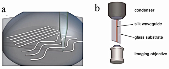 - Parker, S.T.; Domachuk, P.; Amsden, J.; Bressner, J.; Lewis, J.A.; Kaplan, D.L.; Omenetto, F.G. Biocompatible Silk Printed Optical Waveguides. Adv. Mater. 2009, 21, 2411–2415. [Google Scholar] [CrossRef]