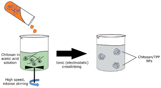 Biopolymer-based nanoparticles such as chitosan nanoparticles can be used to provide optical clarity. Coelho et al. augmented the viability of an optical implant through the incorporation of chitosan nanoparticles [37]. The method of fabrication involved the addition of chitosan to acetic acid with heat and intense stirring 12 h before filtration [37]. This method of fabrication most closely resembles spray drying, where chitosan is added to acetic acid before the nanoparticles are extruded by passing the solution through a nozzle. This is generally regarded as a simple and expedient method for synthesizing chitosan nanoparticles because it does not require separate drying steps. Another popular method of chitosan nanoparticle synthesis involving acetic acid is ionic gelation, which is shown in Figure 9. In this method of fabrication, chitosan is added to acetic acid and sodium tripolyphosphate (TPP) under intense stirring. The nanoparticles are created via ionic crosslinking. One disadvantage of this method is that it requires several post-processing steps, including washing and centrifugation cycles [38].
