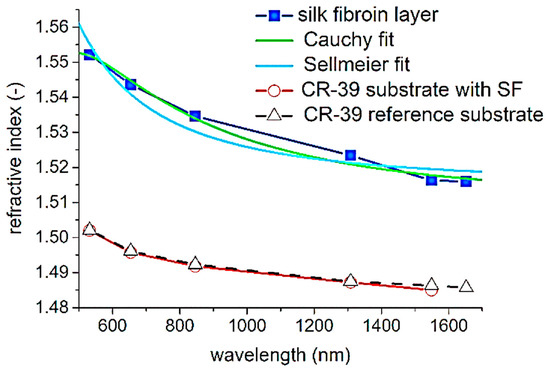 Dispersion curves of the silk fibroin layer and full construct with Cauchy and Sellmeier models [41] (reproduced with permission from Elsevier, 2021).