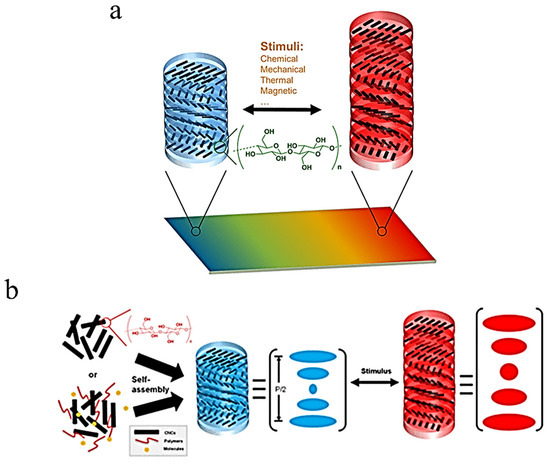 (a) Schematic representation of shift of CNC reflection spectrum on exposure to stimuli. (b) Reflection spectrum change represented by variation in helical pitch [46]. Reproduced with permission from the American Chemical Society, 2020.