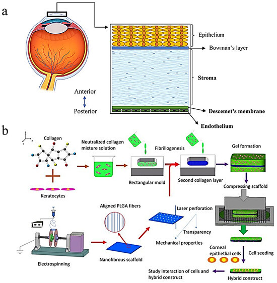 (a) Anatomy of the cornea [48] (reproduced with permission from Frontiers, 2021). (b) Method of synthesis for the ocular implant seen in Kong et al. [51] (reproduced with permission from Springer Nature, 2017).