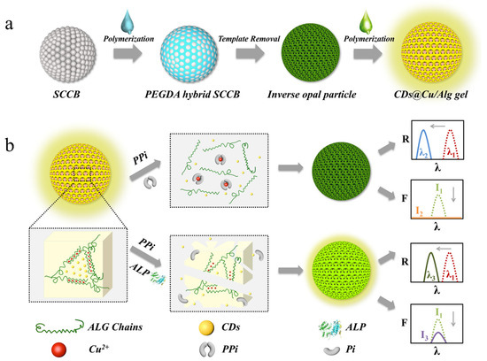 - Wang, Y.; Zhang, D.; Zhang, H.; Shang, L.; Zhao, Y. Responsive photonic alginate hydrogel particles for the quantitative detection of alkaline phosphatase. NPG Asia Mater. 2022, 14, 54. [Google Scholar] [CrossRef]