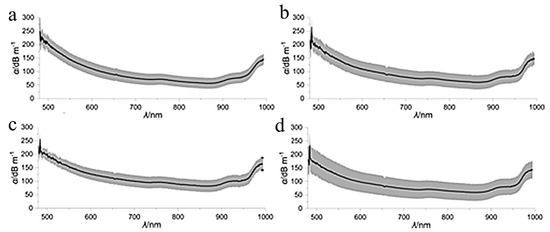 Attenuation loss spectra of cellulose optical fibers with different cladding materials: (a) bare core fiber; (b) cellulose diacetate cladding; (c) cellulose acetate propionate cladding; and (d) cellulose acetate butyrate cladding [60] (reproduced with permission from the American Chemical Society, 2021).