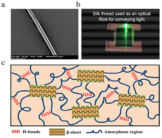 Tow et al. reported the potential viability of spider silk as a component in chemically sensitive optical fibers. The spider silk discussed in the article is notable for its unique composition in the inclusion of crystalline β-sheet blocks among an otherwise amorphous polymer network, as shown in Figure 15c. Figure 15a shows an SEM image of the fiber and Figure 15b demonstrates the fiber serving as a medium for light propagation. The chemical properties of the crystalline regions, and the optical changes induced by chemical interactions with other molecules, cause this material to be sensitive to a variety of potential stimuli, including humidity [62]. The optical properties of N. clavipes spider silk were also measured, and the propagation losses of this fiber were shown to be an order of magnitude less than degummed silkworm, lending to its promise in this particular application.