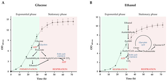 On the other hand, when ethanol is used as a carbon source, yeast metabolism is mainly respiratory (Figure 1B). In particular, during the exponential growth phase, the main pathway is the mitochondrial Krebs cycle, which leads to energy production [25]. When ethanol becomes limiting, yeast cells respond with growth arrest and enter the stationary phase [25,26]. During this growth phase, the yeast cells continue to produce ATP through mitochondrial respiration; at the same time, the glyoxylate pathway allows the synthesis of sugars (Figure 1B).