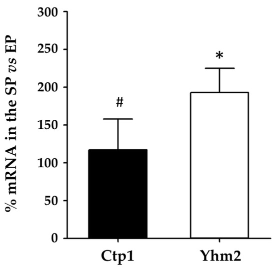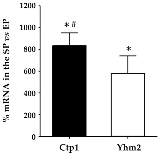 Ctp1 and Yhm2 expression in wild-type yeast cells grown in culture media containing ethanol. mRNA levels in the stationary phase (SP) were compared to mRNA levels in the exponential phase (EP) which were set to 100%. * p < 0.005 vs. EP; # p < 0.005 vs. Yhm2 mRNA.