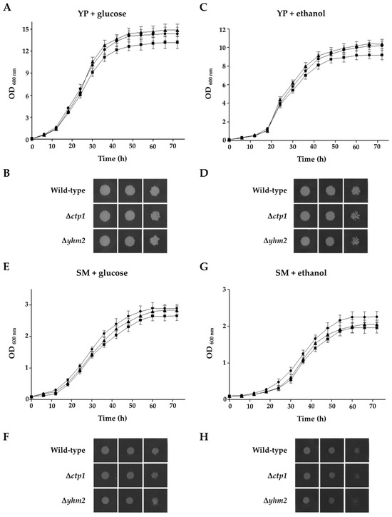 Growth behavior of wild-type and deleted strains under various conditions. Wild-type (●), ∆ctp1 (◼), and ∆yhm2 (▲) cells were inoculated in liquid glucose-supplemented YP (A), ethanol-supplemented YP (C), glucose-supplemented SM (E), or ethanol-supplemented SM medium (G). The optical density (OD) values at 600 nm refer to cell cultures after the indicated growth times. Three-fold serial dilutions of wild-type and deleted cells were also plated on solid YP medium supplemented with glucose (B) or ethanol (D) and solid SM medium supplemented with glucose (F) or ethanol (H). Pictures given in (B,D,F,H) were taken after 2 or 3 days to show yeast growth performance. Growth curves data are expressed as the mean ± SD. Differences were considered statistically significant for p-values < 0.005.