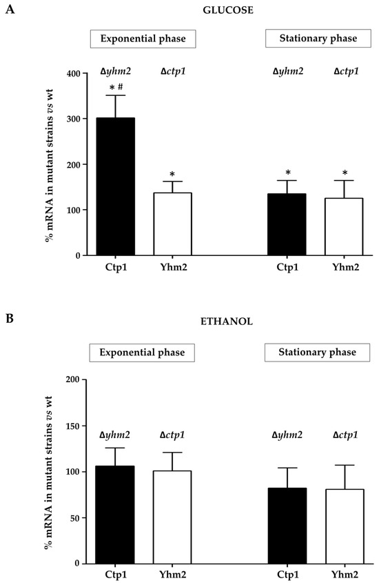 Expression of Ctp1 and Yhm2 in mutants compared with wild-type cells grown in glucose-containing (A) or ethanol-supplemented (B) culture media. mRNA levels found in ∆ctp1 and ∆yhm2 yeast cells were compared with the expression levels in the wild-type strain in the same growth phase (exponential or stationary), which were set to 100%. * p < 0.005 vs. wild-type; # p < 0.005 vs. Yhm2 mRNA.