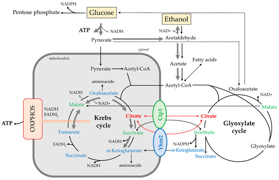 Role of Ctp1 and Yhm2 in yeast metabolism in the presence of fermentable (glucose) and nonfermentable carbon sources (ethanol). The transport of citrate is shown in red. Substrates that can be transported by Ctp1 are colored green, while those that can be transported by Yhm2 are colored blue. Grey and black arrows describe fermentative and respiratory metabolism, respectively.