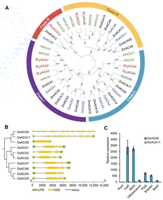 Phylogenetic tree of the OsACA family members and their expression in rice tissues. (A) Phylogenetic relationship between ACA proteins from O. sativa (blue), A. thaliana (green), S. lycopersicum (red), and Z. mays (black). (B) Cluster and gene structure of OsACAs. The neighbor-joining tree was constructed using 1000 bootstrap replicates. (C) Expression pattern of OsACA9 and OsACA11 in rice different tissues by RT-qPCR.